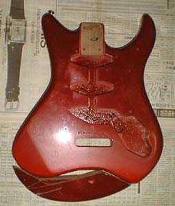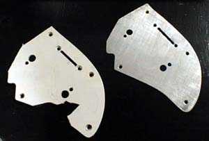 破損した部分のピックガード(左)と、新たにアルミ板で作ったピックガード(右)